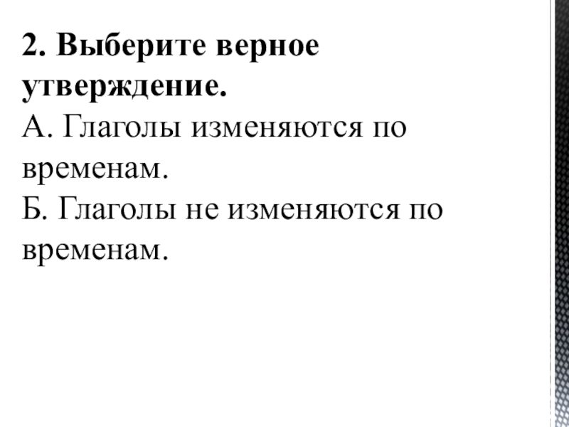 2. Выберите верное утверждение. А. Глаголы изменяются по временам.  Б. Глаголы не изменяются по временам.