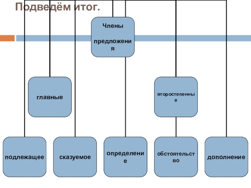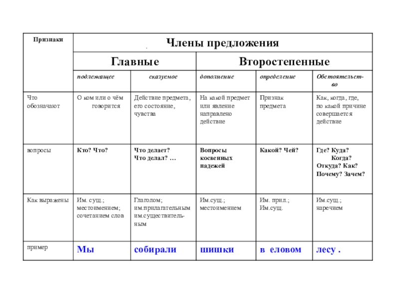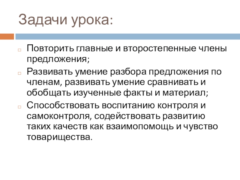 Задачи урока:Повторить главные и второстепенные члены предложения;Развивать умение разбора предложения по членам, развивать умение сравнивать и обобщать
