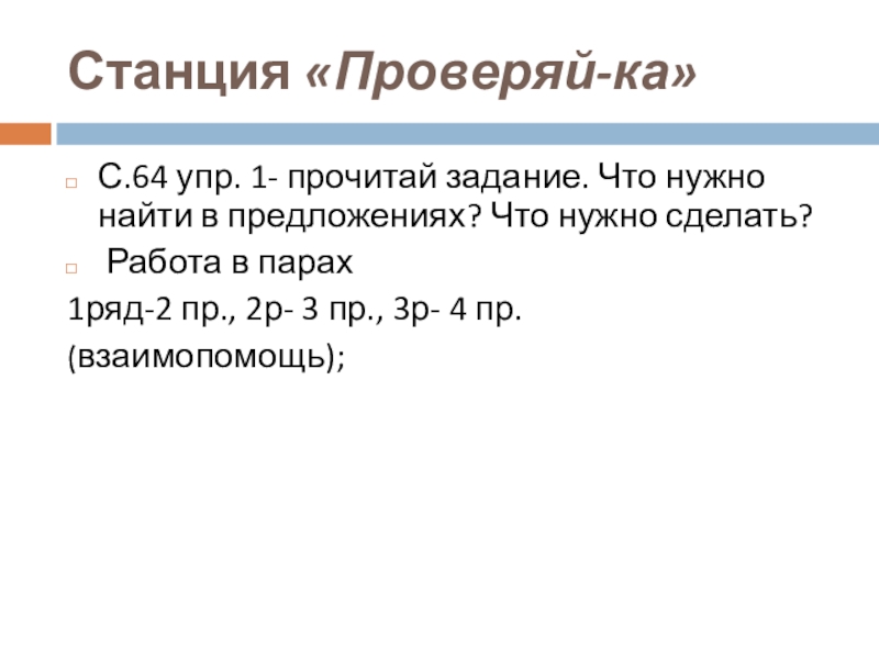 Станция «Проверяй-ка»С.64 упр. 1- прочитай задание. Что нужно найти в предложениях? Что нужно сделать? Работа в парах