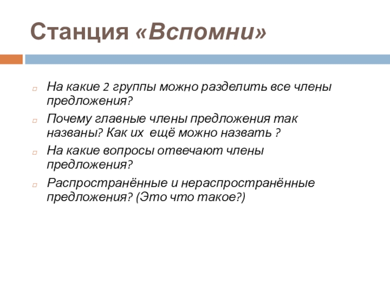 Станция «Вспомни»На какие 2 группы можно разделить все члены предложения?Почему главные члены предложения так названы? Как их