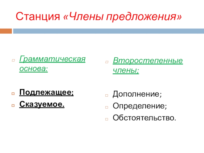 Станция «Члены предложения»Грамматическая основа:Подлежащее;Сказуемое.Второстепенные члены;Дополнение;Определение;Обстоятельство.