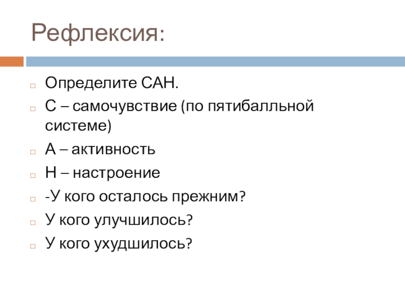 Рефлексия:Определите САН.С – самочувствие (по пятибалльной системе)А – активностьН – настроение-У кого осталось прежним?У кого улучшилось?У кого