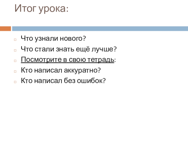 Итог урока: Что узнали нового?Что стали знать ещё лучше?Посмотрите в свою тетрадь: Кто написал аккуратно?Кто написал без