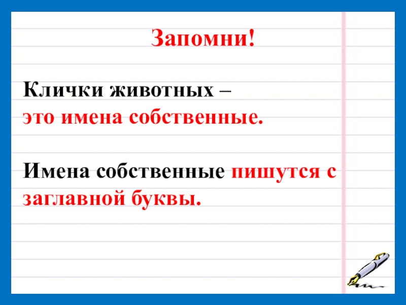 Запомни!Клички животных – это имена собственные. Имена собственные пишутся с заглавной буквы.