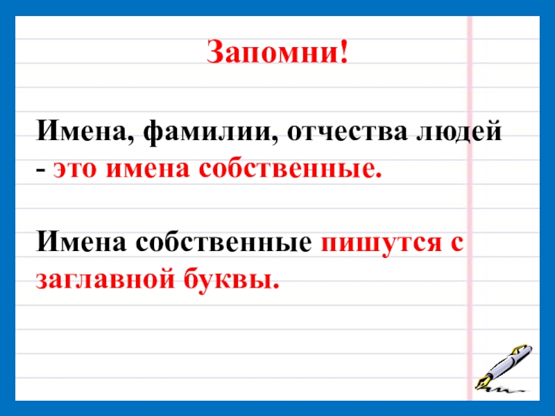 Запомни!Имена, фамилии, отчества людей - это имена собственные. Имена собственные пишутся с заглавной буквы.