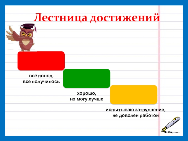 Лестница достиженийвсё понял, всё получилосьхорошо, но могу лучшеиспытываю затруднение, не доволен работой
