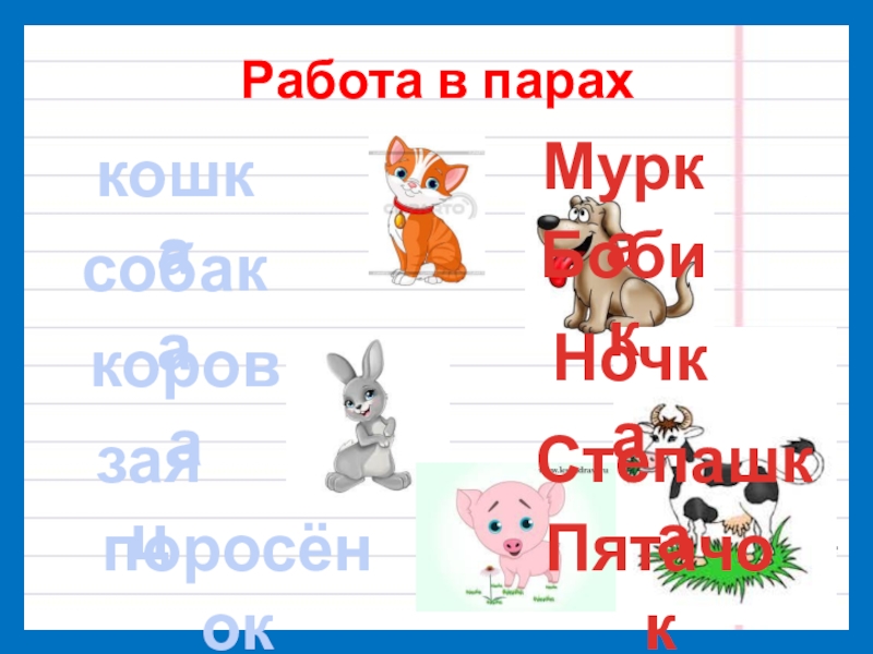 Работа в парахкошкасобакакоровазаяцпоросёнокМуркаБобикНочкаСтепашкаПятачок