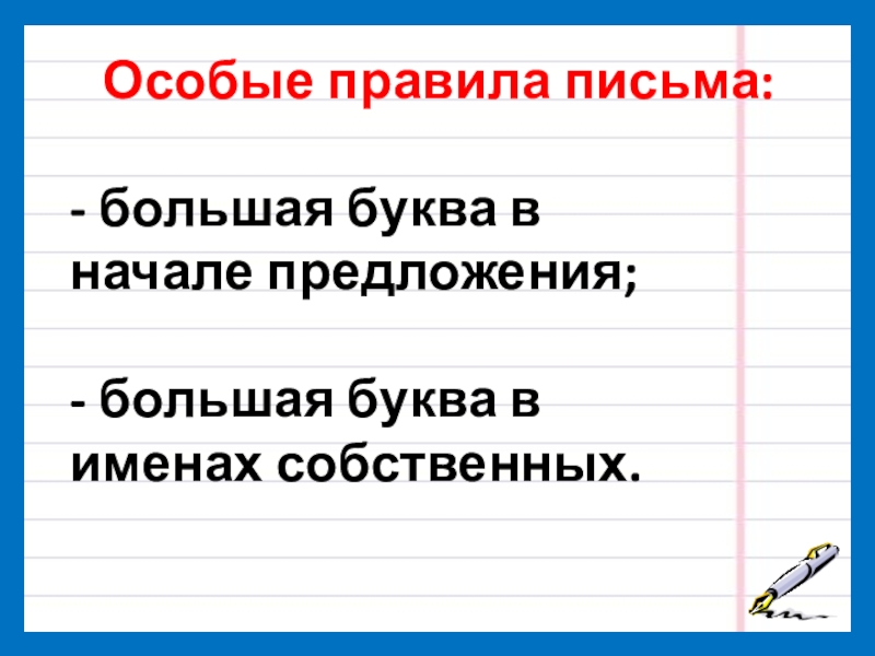 Особые правила письма: - большая буква в начале предложения; - большая буква в именах собственных.