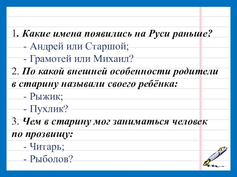 1. Какие имена появились на Руси раньше? 	- Андрей или Старшой; 	- Грамотей или Михаил?2. По какой