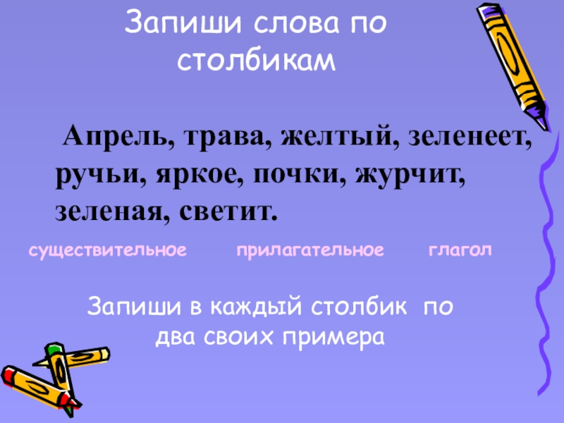 Запиши в каждый столбик по два своих примера