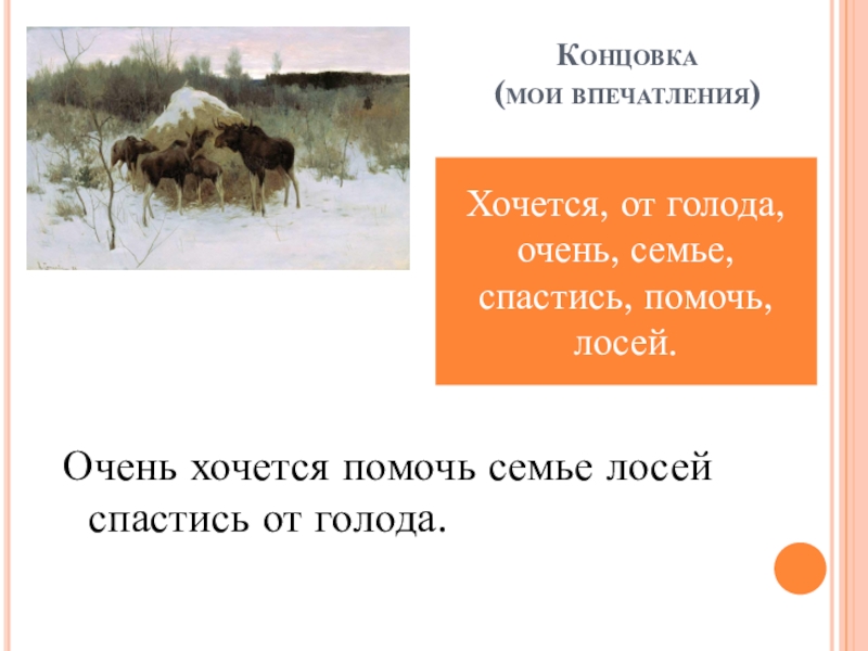 Концовка  (мои впечатления)Очень хочется помочь семье лосей спастись от голода.