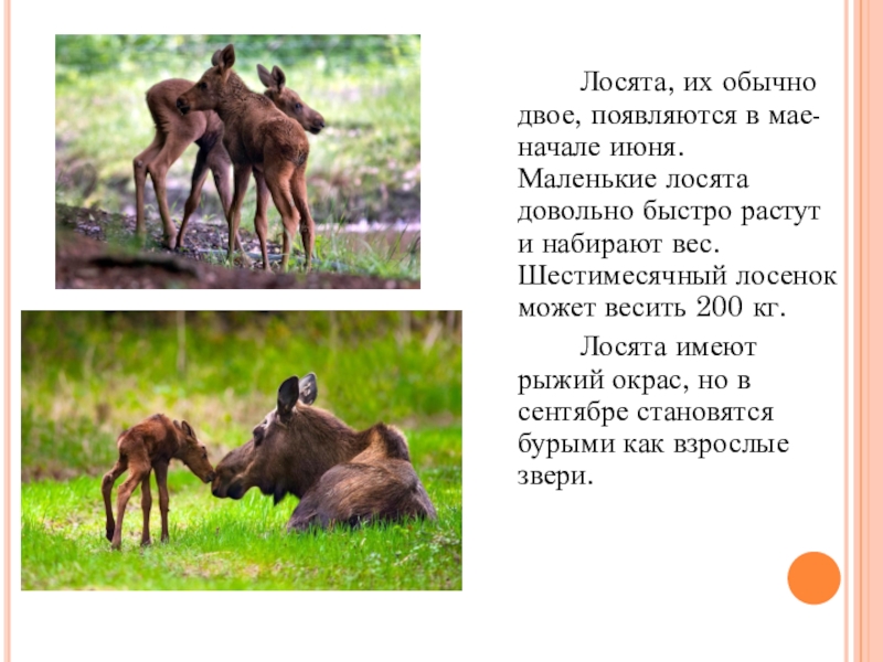 Слайд 4 Лосята, их обычно двое, появляются в мае-начале июня. Маленькие лосята довольно