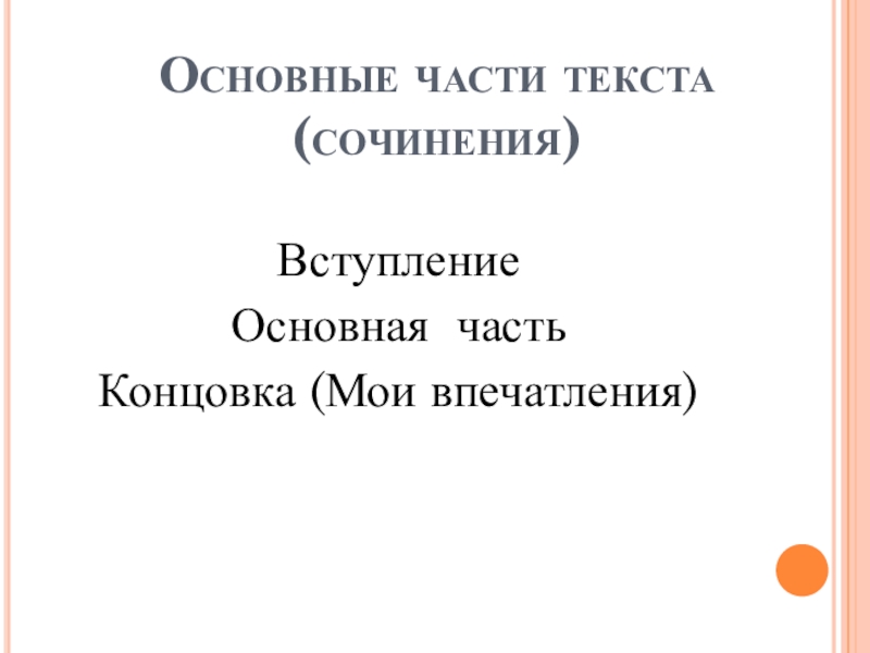 Основные части текста (сочинения)ВступлениеОсновная частьКонцовка (Мои впечатления)