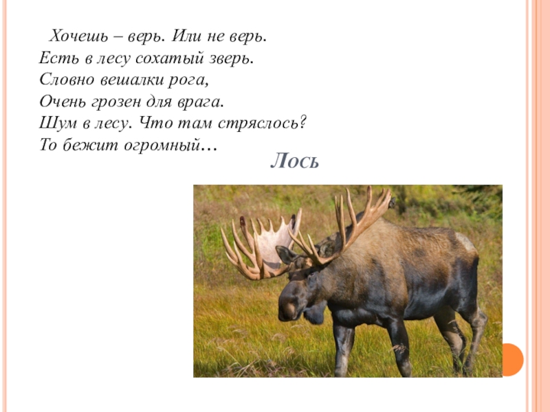 Лось Хочешь – верь. Или не верь. Есть в лесу сохатый зверь. Словно вешалки рога, Очень грозен для врага. Шум в лесу. Что там стряслось? То бежит огромный…