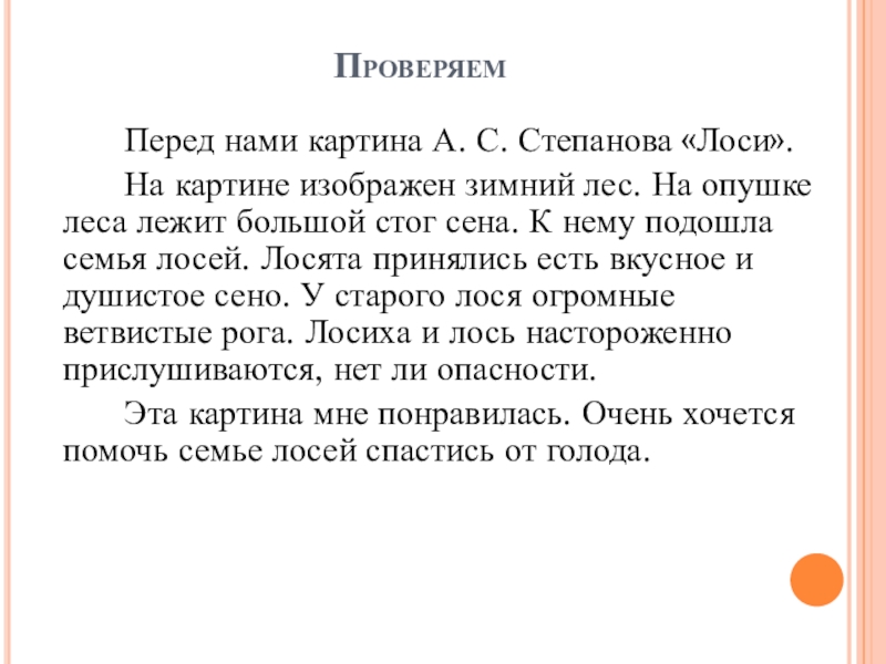 Проверяем		Перед нами картина А. С. Степанова «Лоси». 		На картине изображен зимний лес. На опушке леса лежит большой