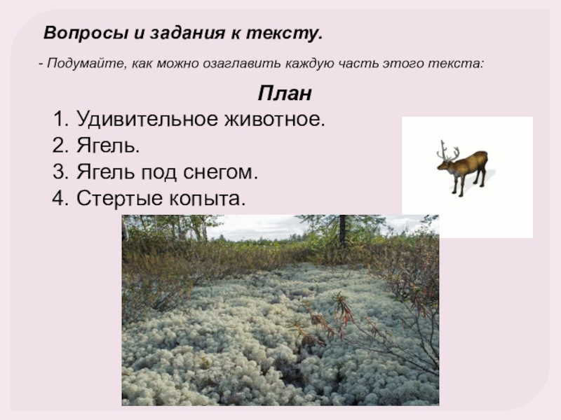 По тундре бродят огромные стада северных оленей. Удивительное животное - северный олень; крупное, сильное, неутомимое! Целый день олень работает, возит по тундре людей, грузы. А распрягут - он сам себе еду добывает.