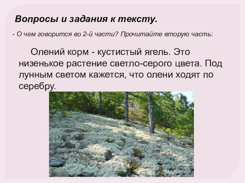 Олений корм - кустистый ягель. Это низенькое растение светло-серого цвета. Под лунным светом кажется, что олени ходят по серебру.
