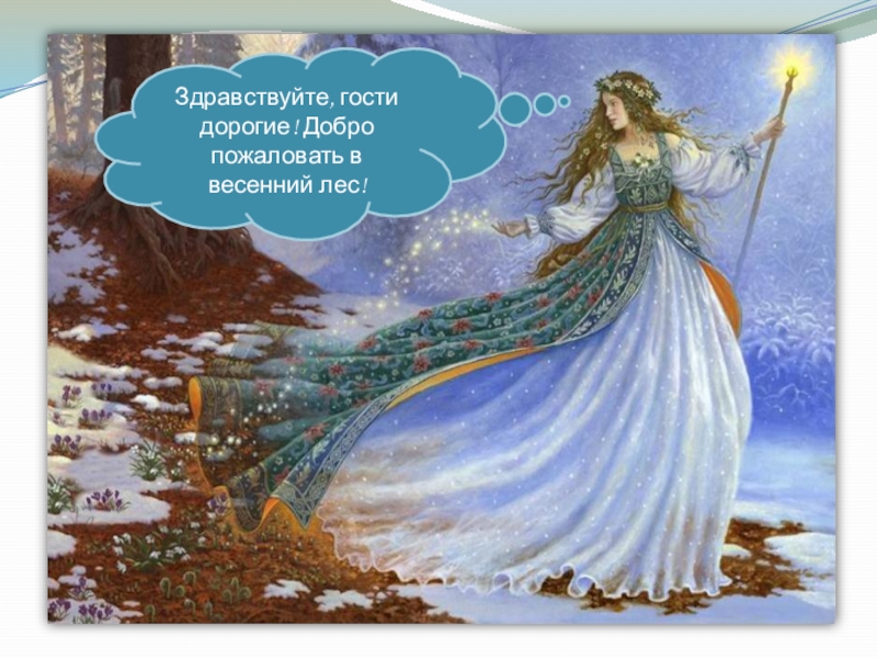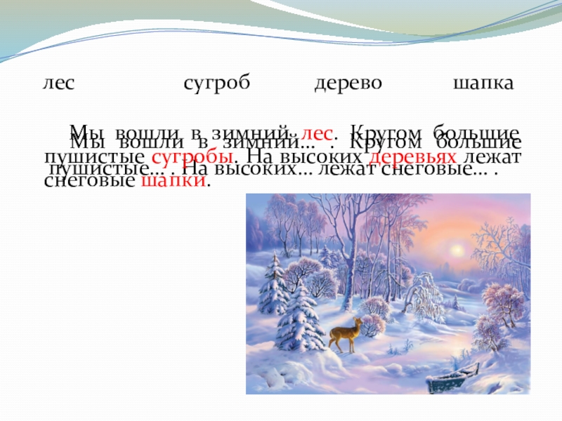Мы вошли в зимний лес. Кругом большие пушистые сугробы. На высоких деревьях лежат снеговые шапки.