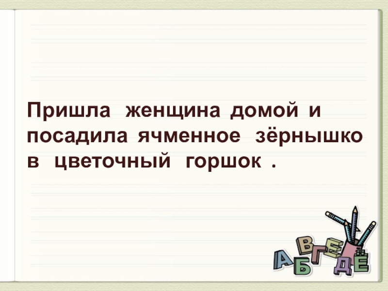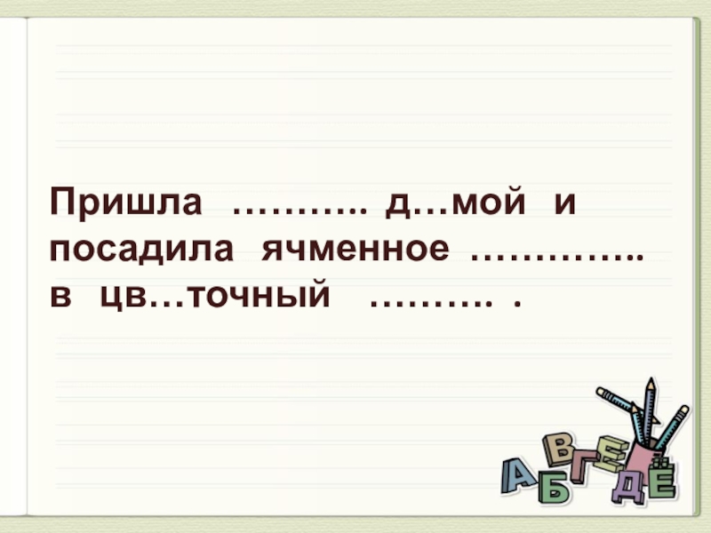 Слайд 2Пришла ……….. д…мой и посадила ячменное ………….. в