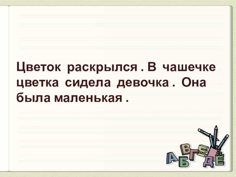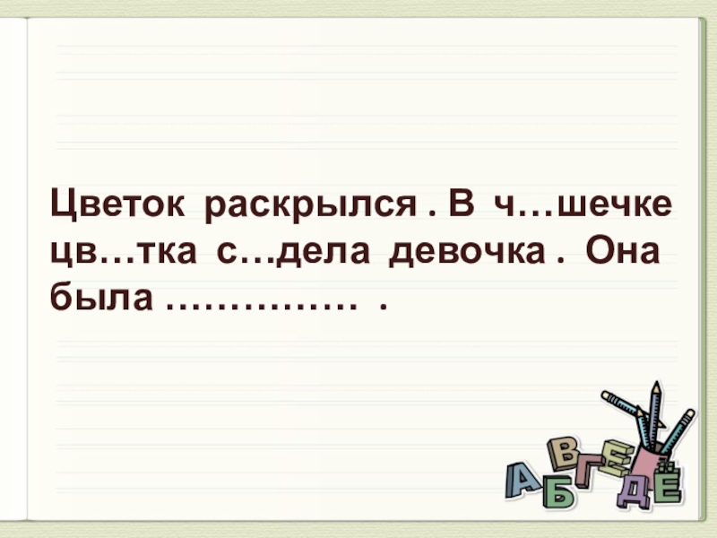 Слайд 4Цветок раскрылся . В ч…шечке цв…тка с…дела девочка . Она была