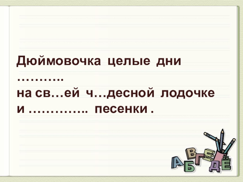 Слайд 6Дюймовочка целые дни ……….. на св…ей ч…десной лодочке и …………..