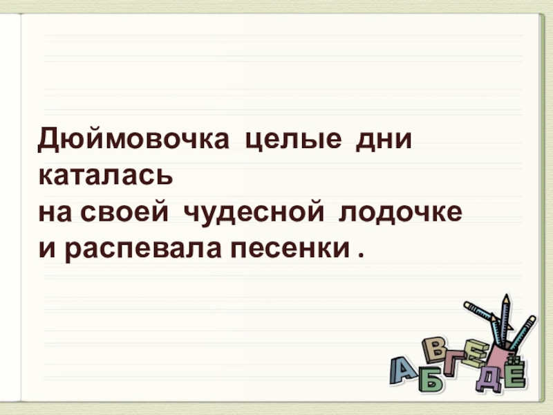 Слайд 7Дюймовочка целые дни каталась на своей чудесной лодочке и распевала песенки