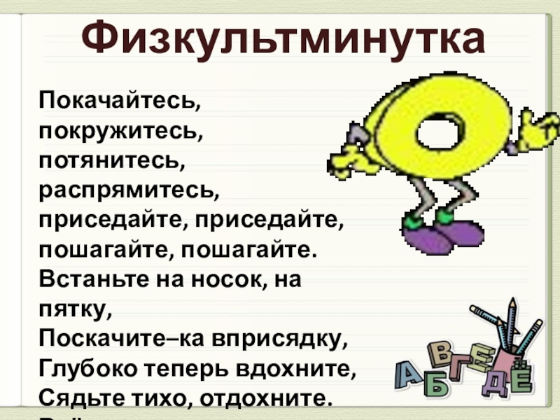 ФизкультминуткаПокачайтесь, покружитесь, потянитесь, распрямитесь, приседайте, приседайте,пошагайте, пошагайте.Встаньте на носок, на пятку, Поскачите–ка вприсядку,Глубоко теперь вдохните, Сядьте тихо,