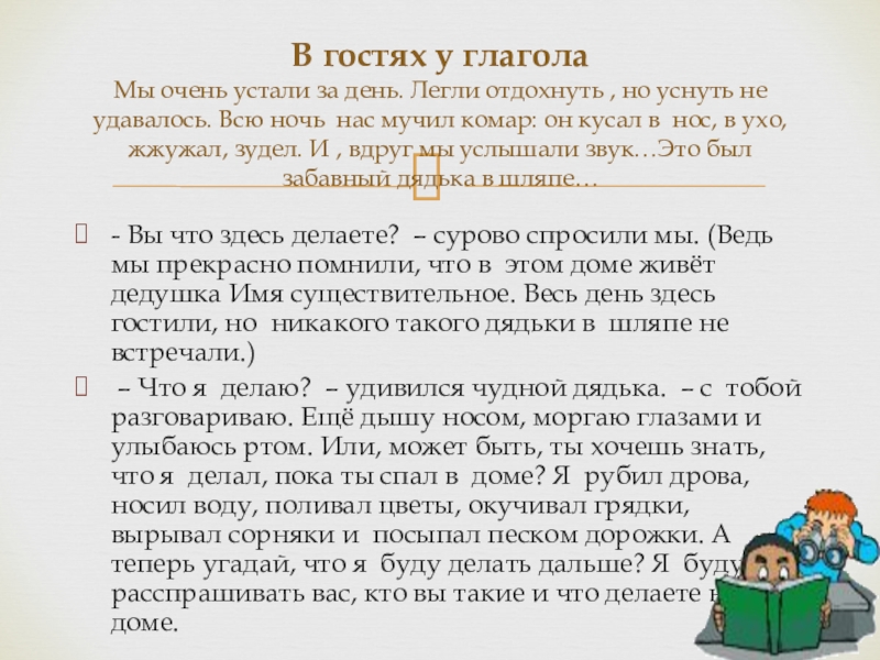 Мы очень устали за день. Легли отдохнуть , но уснуть не удавалось. Всю ночь нас мучил комар: он кусал в нос, в ухо, жжужал, зудел. И , вдруг мы услышали звук…Это был забавный дядька в шляпе…