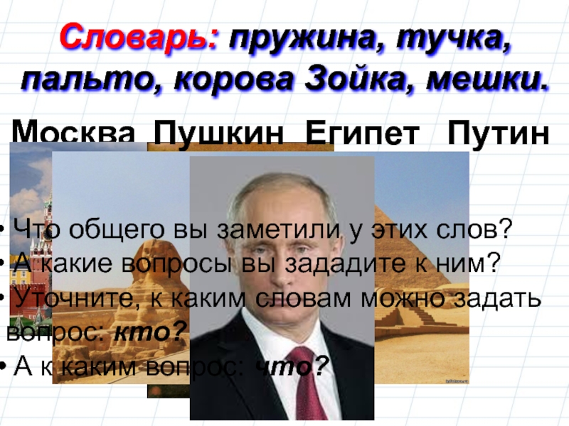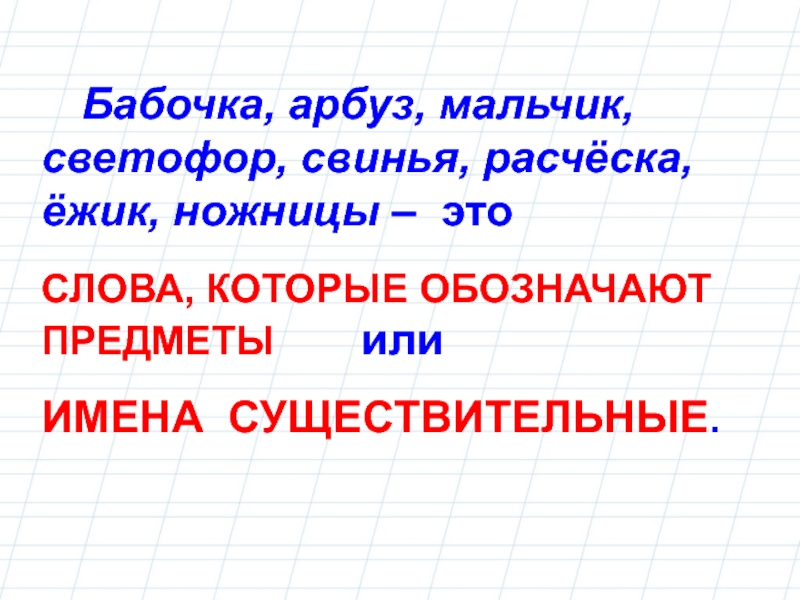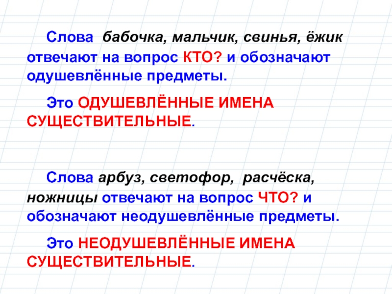 Слова бабочка, мальчик, свинья, ёжик отвечают на вопрос КТО? и обозначают одушевлённые предметы.