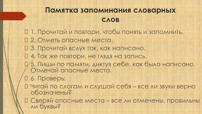 Памятка запоминания словарных слов1. Прочитай и повтори, чтобы понять и запомнить.2. Отметь опасные места.3. Прочитай вслух так,