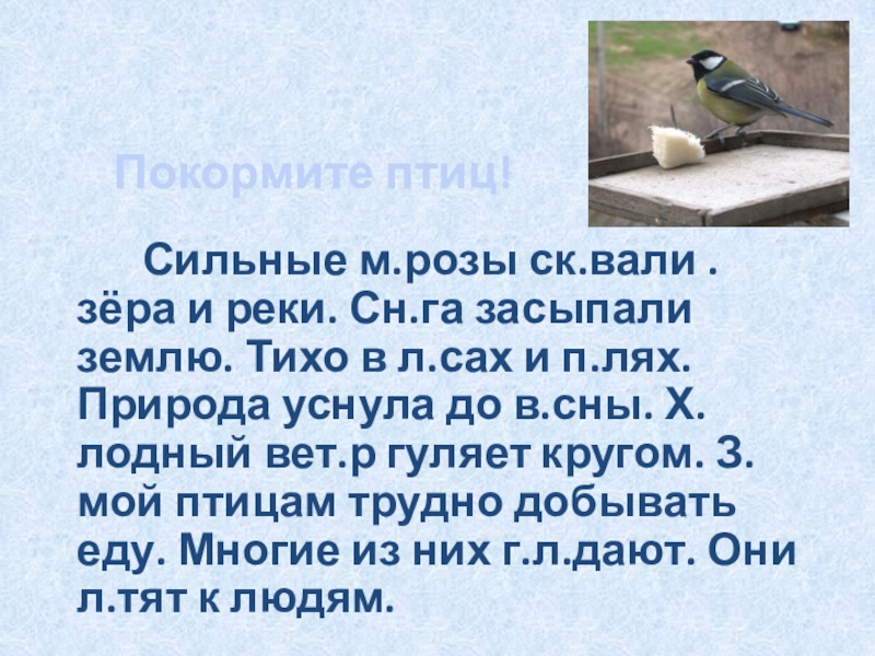 Сн.га засыпали землю. Тихо в л.сах и п.лях. Природа уснула до в.сны. Х.лодный вет.р гуляет кругом. З.мой птицам трудно добывать еду. Многие из них г.л.дают. Они л.тят к людям.
