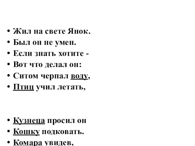Жил на свете Янок.Был он не умен.Если знать хотите -Вот что делал он:Ситом черпал воду,Птиц учил летать,Кузнеца