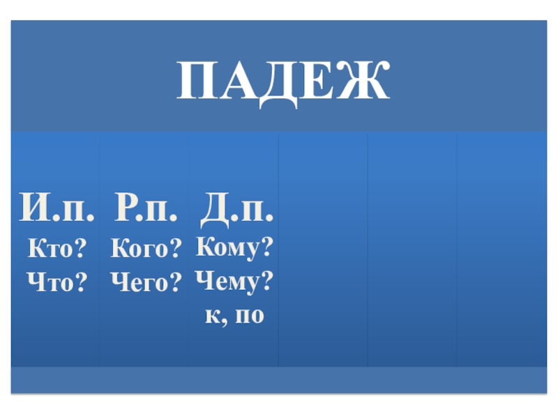 ПАДЕЖИ.п.Кто?Что?Р.п.Кого?Чего?Д.п.Кому?Чему?к, по