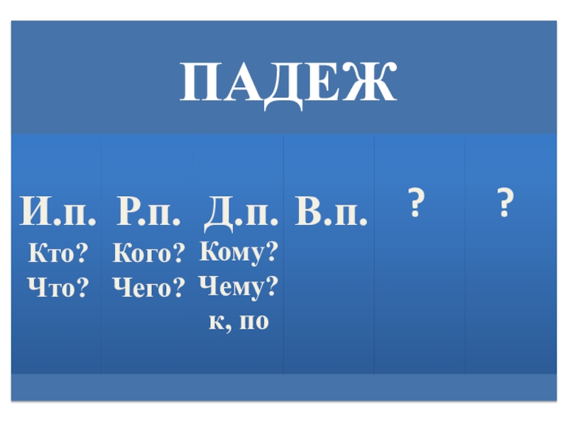 ПАДЕЖИ.п.Кто?Что?Р.п.Кого?Чего?Д.п.Кому?Чему?к, поВ.п.??