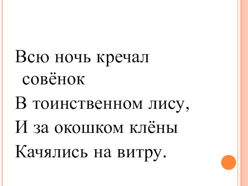 Всю ночь кречал совёнокВ тоинственном лису, И за окошком клёныКачялись на витру.