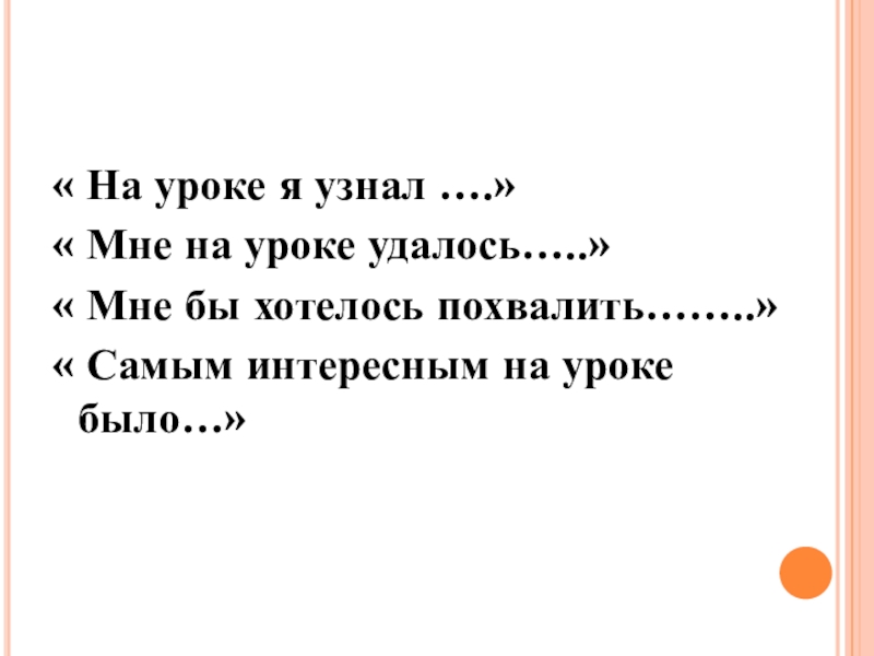 « На уроке я узнал ….»« Мне на уроке удалось…..»« Мне бы хотелось похвалить……..»« Самым интересным на