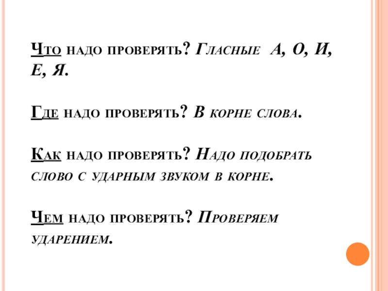 Что надо проверять? Гласные  А, О, И, Е, Я.   Где надо проверять? В корне слова.