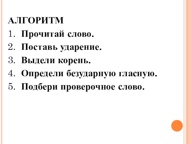 АЛГОРИТМ1. Прочитай слово.2. Поставь ударение.3. Выдели корень.4. Определи безударную гласную.5. Подбери проверочное слово.