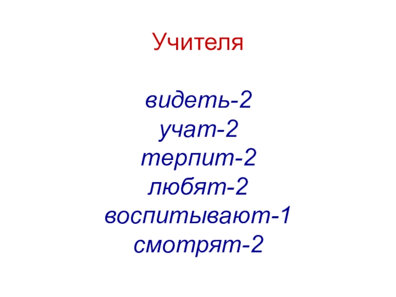 Слайд 14Учителя видеть-2 учат-2 терпит-2 любят-2 воспитывают-1 смотрят-2