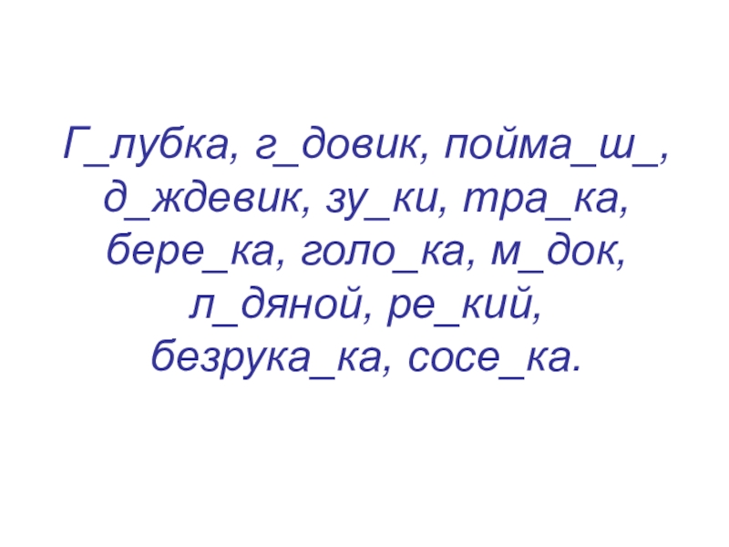 Слайд 3Г_лубка, г_довик, пойма_ш_, д_ждевик, зу_ки, тра_ка, бере_ка, голо_ка, м_док,