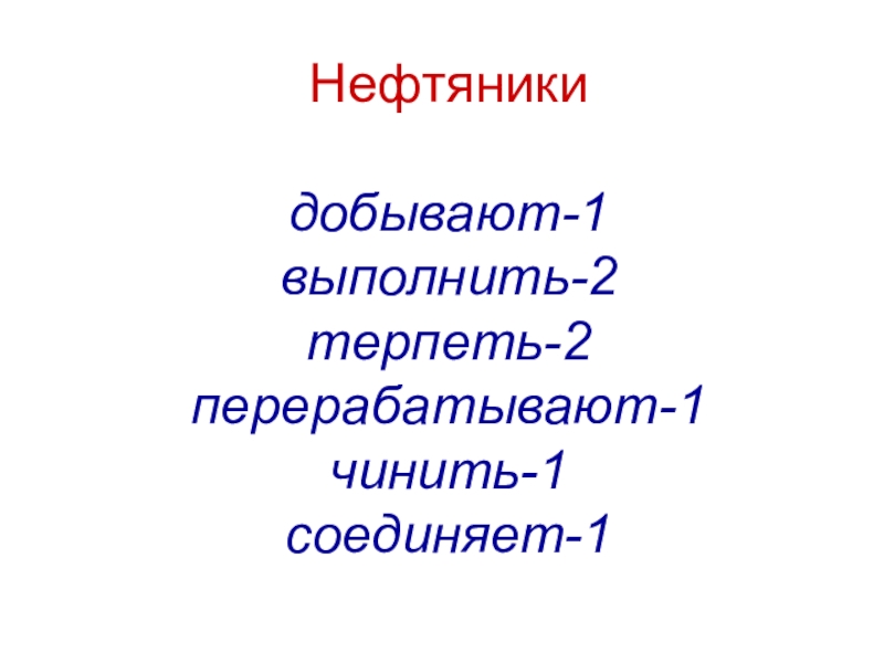Слайд 8Нефтяники добывают-1 выполнить-2 терпеть-2 перерабатывают-1 чинить-1 соединяет-1