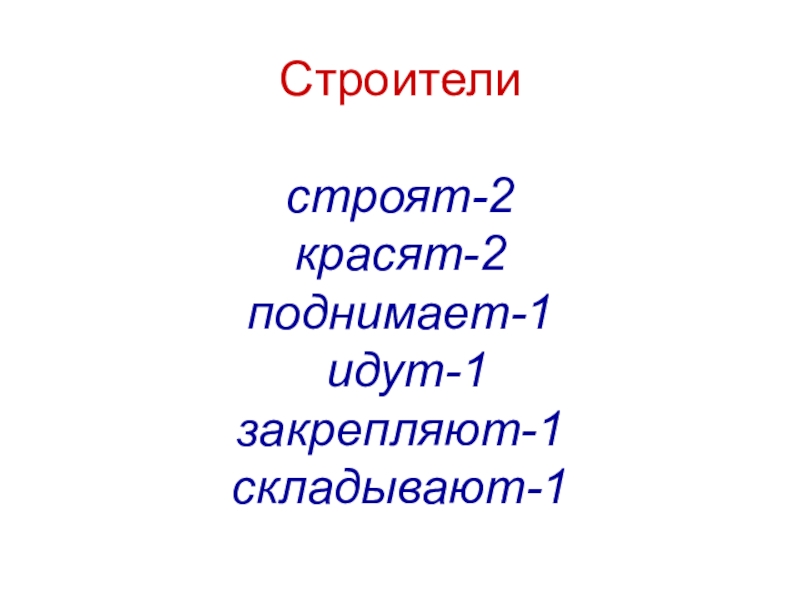 Слайд 11Строители строят-2 красят-2 поднимает-1 идут-1 закрепляют-1 складывают-1
