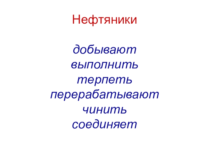 Слайд 7Нефтяники добывают выполнить терпеть перерабатывают чинить соединяет