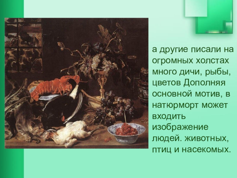 Слайд 8а другие писали на огромных холстах много дичи, рыбы, цветов Дополняя