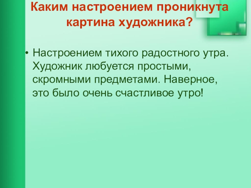 Слайд 17Подумайте, почему картина называется «Утренний натюрморт»?