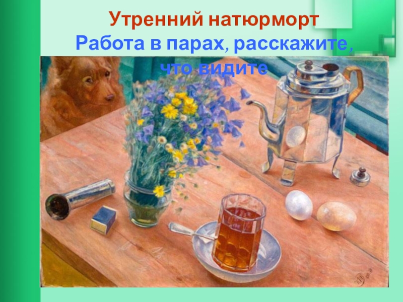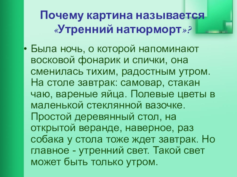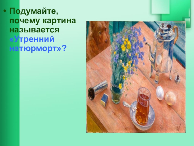 Слайд 18Почему картина называется «Утренний натюрморт»?
