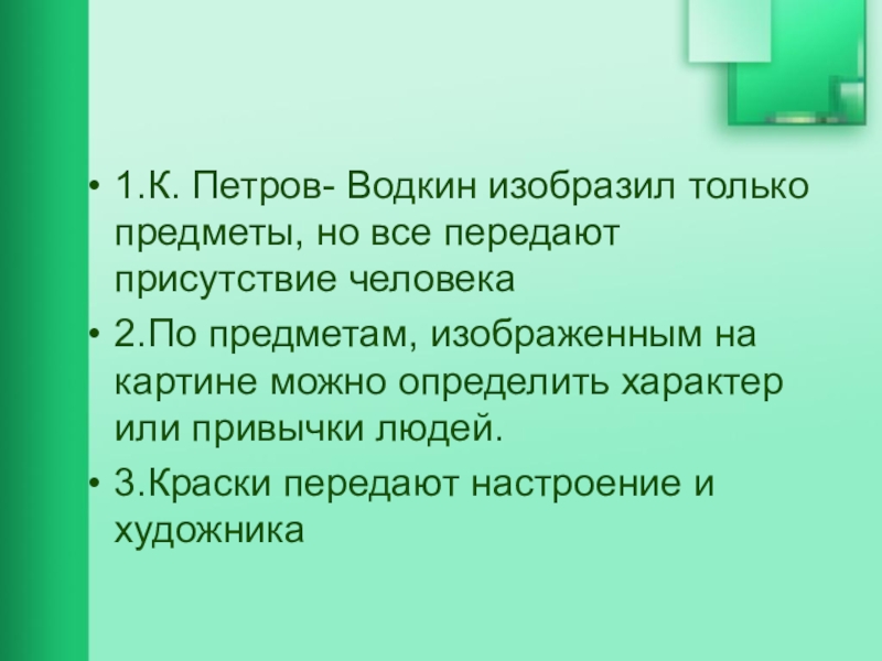 1.К. Петров- Водкин изобразил только предметы, но все передают присутствие человека