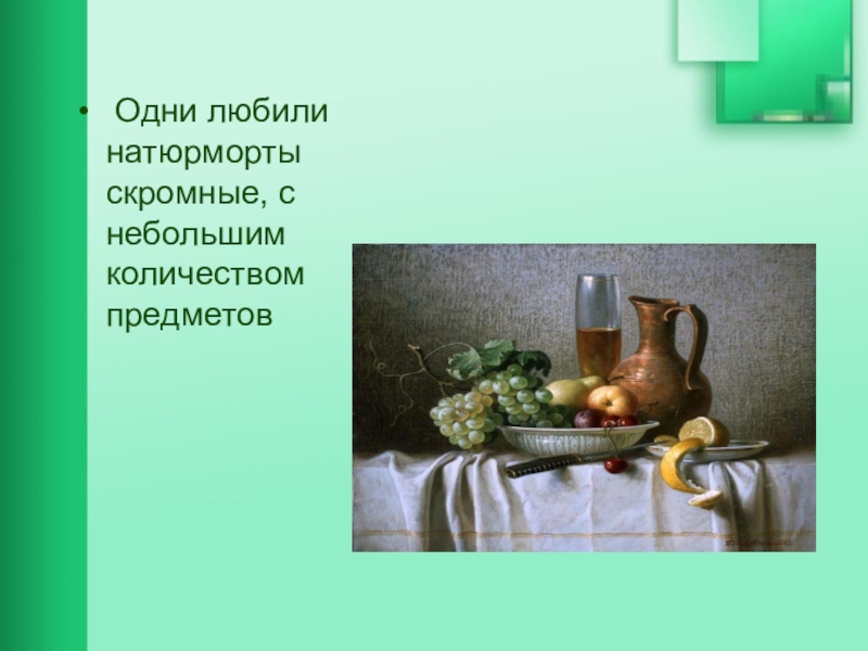 Слайд 7 Одни любили натюрморты скромные, с небольшим количеством предметов