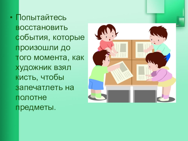 Слайд 31Попытайтесь восстановить события, которые произошли до того момента, как художник взял