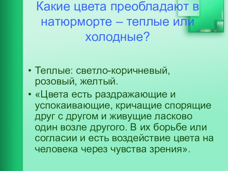 Слайд 29Какие цвета преобладают в натюрморте – теплые или холодные?
